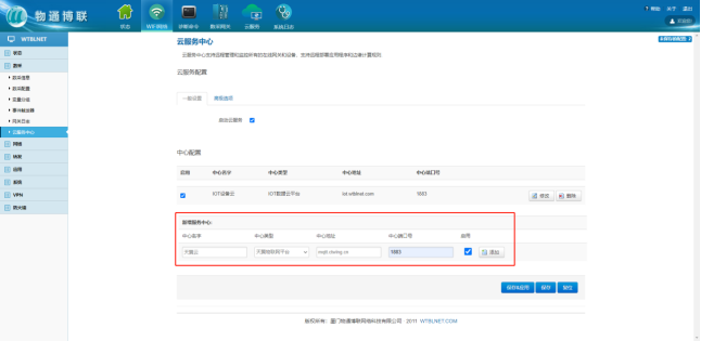 打开k豆kdpay钱包AI网关Web界面==>点击云服务==>中心类型选择天翼物联网平台==>输入相应信息==>勾选启用==>点击”添加”。