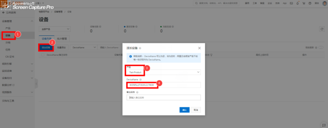项目生成后,点击“设备管理”选择“设备”,选取右边“添加设备”。