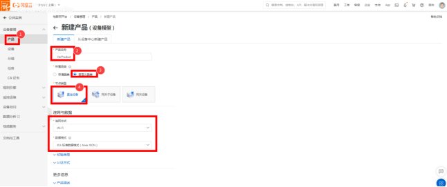 所属品类根据实际场景选择,节点类型选“直连设备”,连网方式,数据格式默认。详见图2