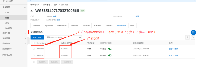 如果网关需要采集多台的PLC设备在阿里云端可以在改产品设备中新增对应台数的子设备,1台PLC设备对应1个阿里云平台的子设备。