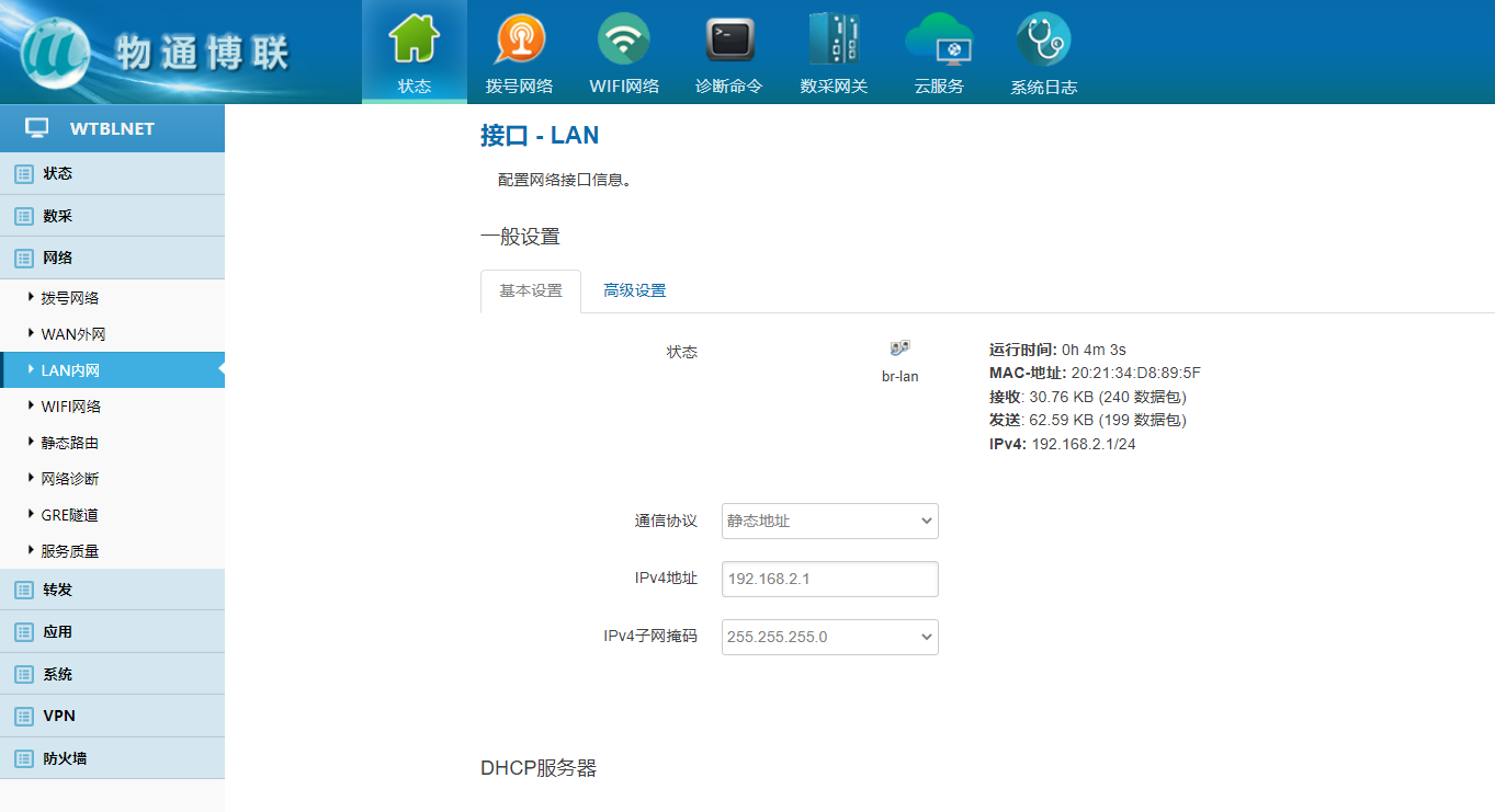 下载中心 视频中心 常见问题 售后服务 工业网关 设备快线 数据云平台 联网设备 问答百科 如何修改工业智能网关的LAN口IP地址? 时间:2022-10-26 09:06:09 点击:7563 关键词:工业智能网关,LAN口 问题:如何修改工业智能网关的LAN口IP地址? 回答: (1)电脑直连网关,确保电脑与网关处于同网段或者自动获取 浏览器里面输入192.168.2.1 (2)登陆网关配置界面 默认用户名/密码:admin/123456 (2)选择网络——Lan内网——更改IPV4地址、子网掩码,保存应用 (3)注意电脑本机IP地址是否与更改地址处于同网段(自动获取需重新拔 插网线) (4)浏览器输入更改后的IP地址登陆到网关配置界面即修改成功 上一篇:工业智能网关和DTU有什么区别吗? 下一篇: 工业智能网关需要另外配4G路由器吗?