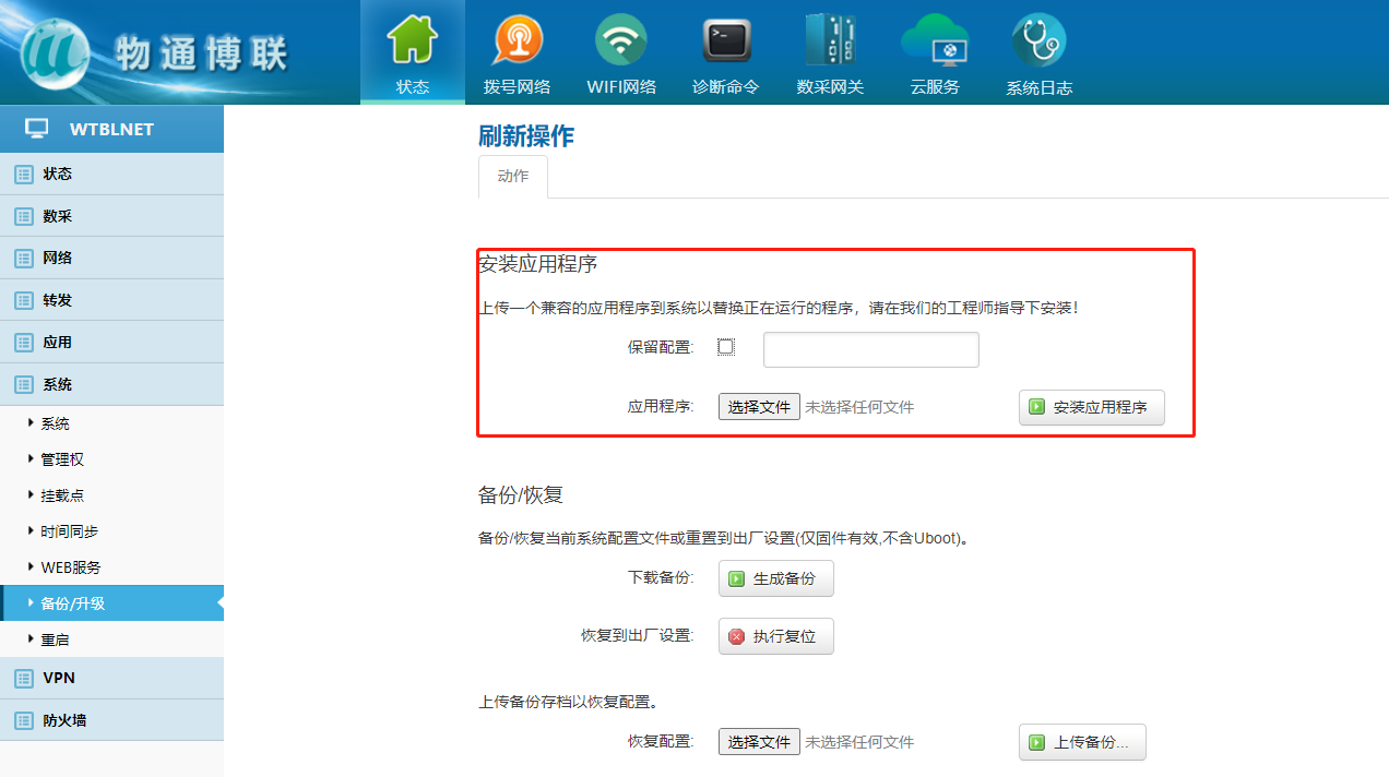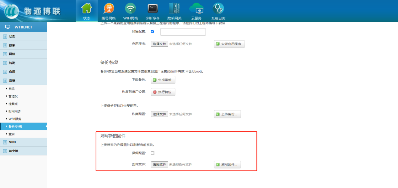 下载中心 视频中心 常见问题 售后服务 工业网关 设备快线 数据云平台 联网设备 问答百科 工业智能网关如何更新程序和固件? 时间:2022-10-26 09:39:53 点击:7792 关键词:工业智能网关,网关配置,固件升级 问题:工业智能网关如何更新程序和固件? 回答: (1)固件升级:后缀为。bin的文件 点击系统—备份/升级—选择文件—刷写程序(不保留配置) (2)IPK文件升级:后缀为。ipk的文件 点击系统—备份/升级—选择文件—输入密码—安装应用程序(不保留配置) 上一篇:工业智能网关时间如何进行同步? 下一篇: 工业智能网关如何连接wifi热点?