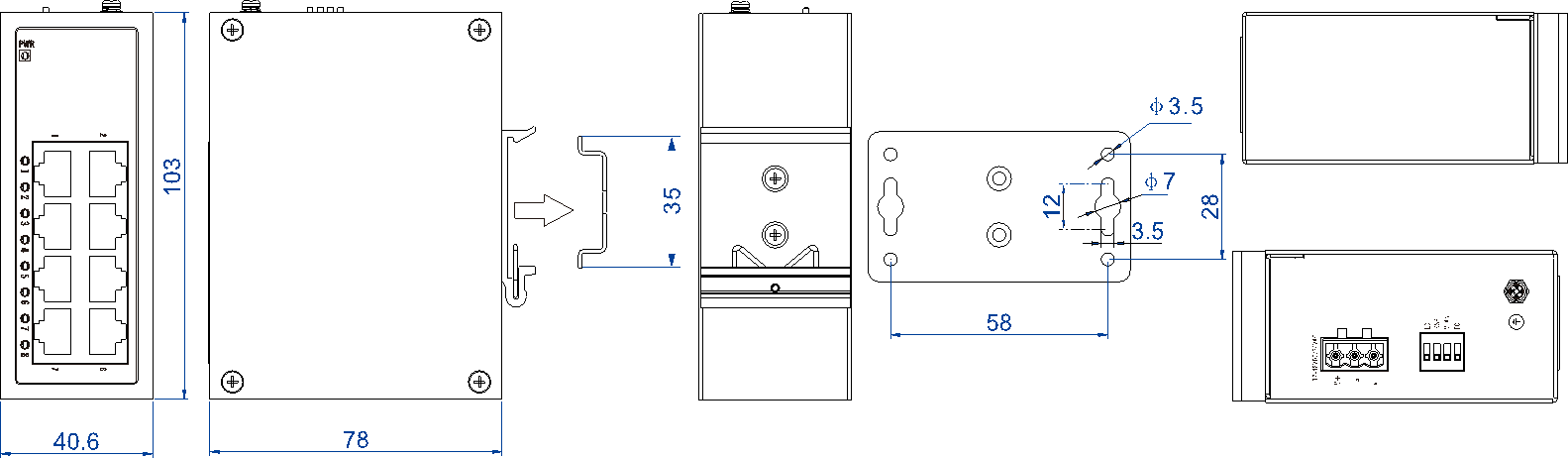 外壳:IP40防护等级,金属外壳 安装:DIN导轨式或壁挂式安装 尺寸(宽×高×深):40.6mm×103mm×78mm |