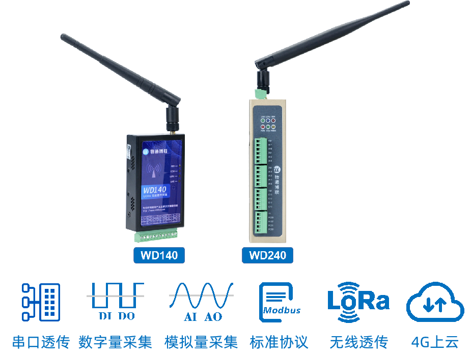 WD240系列工业数传终端是一款实现多路AI、AO、DI、DO数据采集的无线