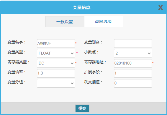 注:变量类型参数选择无效,主要根据寄存器地址来 寄存器类型:只有一种DC 寄存器地址:查表获取,比如DL/T645-07协议的A相电压,查表对应的数据标识是02010100,B相电表对应02010200。