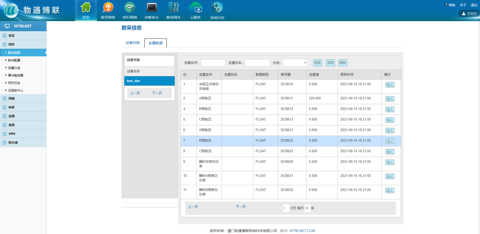 数采配置(设备信息+变量参数)完成后,重启采集程序并生效配置,即可在:数采信息---变量数据---设备名称 中看到采集上来的数据。