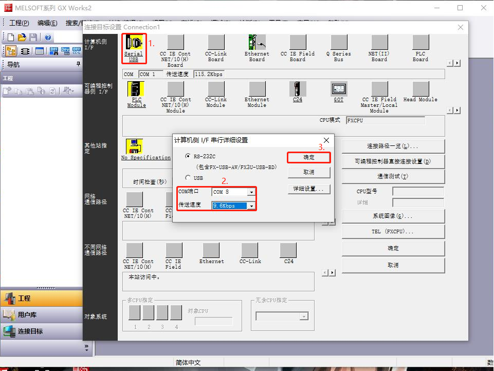 RS-232 通信接线 RS-485 通信接线 PLC 网关端 PLC 网关 线序 2 RX SDA、RDA 短接 RX + 线序 3 TX SDB、RDB 短接 TX - 线序 5 GND -------- 3、编程软件设置打开 MELSOFT系列 GX Works2,登录 FX3UPLC,设置 FX3U 串口参数,点击“在线”——“PLC读取”——“模块参数”,具体设置见下图: