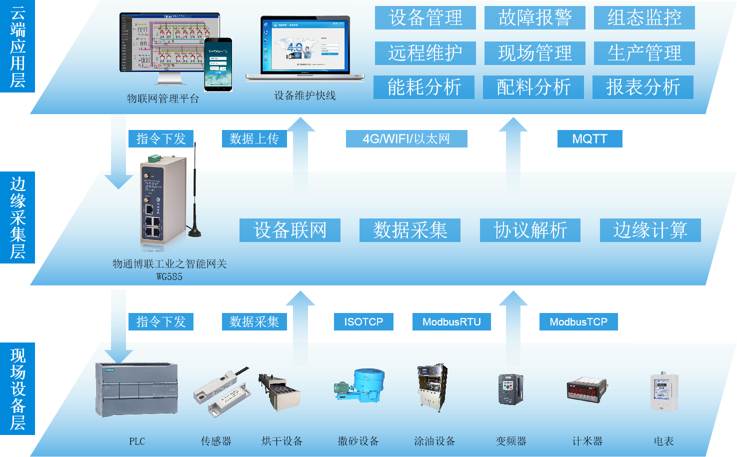 工厂现场具有PLC、温度传感器、压力传感器、烘干机、涂油机、撒沙设备、电表、计米器等设备,顺利获得串口、网口等设备接口将现场设备连接到k豆kdpay钱包AI工业智能网关WG585,网关采集现场设备数据后顺利获得4G/WIFI/以太网等网络方式将数据顺利获得MQTT协议实时上传到物联网管理平台进行分析、处理,管理者顺利获得电脑和手机就能远程查看现场设备运行参数、设备状态、工艺组态、生产情况、物料消耗以及故障记录等,实现设备管理、现场管理、生产管理、远程维护、能耗分析、配料分析、数据分析应用等功能,实现产品生命周期和备品备件管理,保障高效率的生产。
