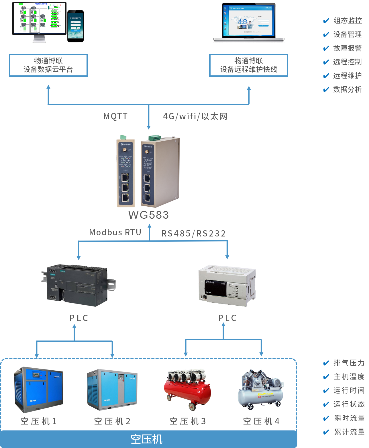 03 解决方案 k豆kdpay钱包AI推出的食品空压机数据采集远程监控系统由工业智能网关WG583和物联网平台组成。工业智能网关WG583顺利获得与空压机PLC通信,实现实时数据采集和传输;云平台与工业智能网关实时通信,实现主机温度、排气压力、瞬时流量、累计流量等数据以及空压机运行状态、运行时间的可视化展示与组态监控;移动端顺利获得在云平台查看调取数据并接收报警信息,就能及时采取措施管理控制与远程维护,保证空压机运行稳定可靠,避免计划外的停机损失。