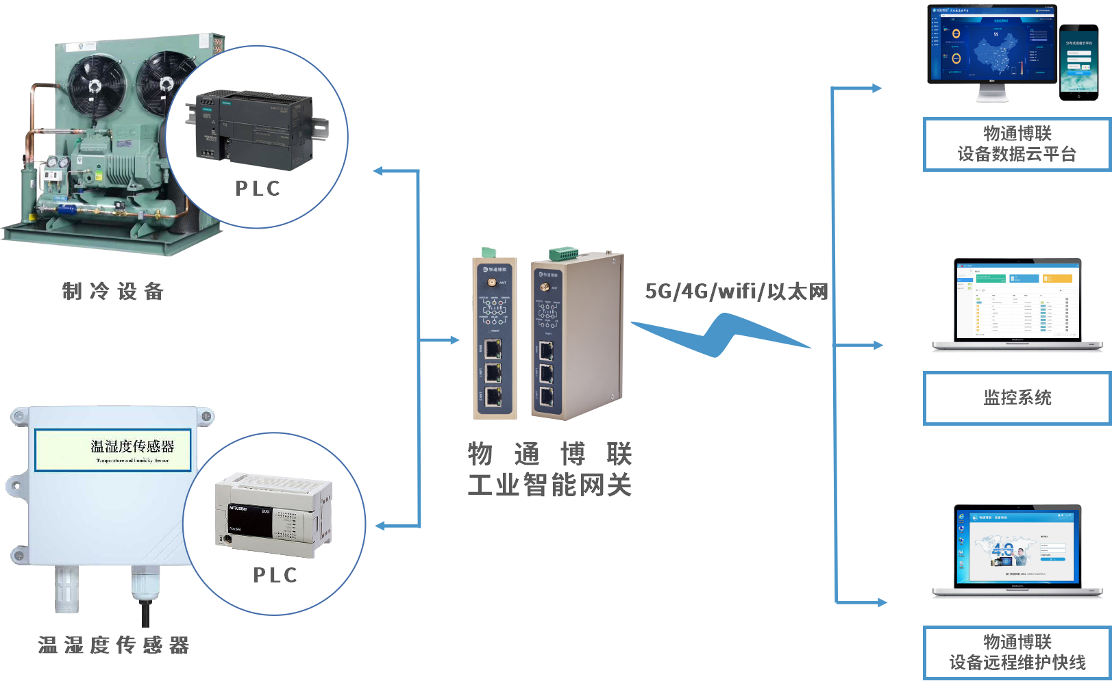 网关可以采集制冷设备PLC和各类传感器的数据,采集温湿度、压力、电压、电流等工艺参数以及设备开关、故障、GPS等状态信息。