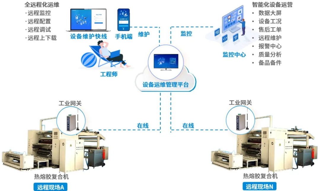 顺利获得构建热熔复合机远程监控智慧运维系统,企业能够实现设备的实时监控与远程维护,减少停机时间,保障客户生产的陆续在性;同时,顺利获得数据整合分析,优化运维资源配置,降低人工与差旅成本,提升运维效率;此外,还能助力企业迭代产品、优化服务,增强在热熔复合设备领域的核心竞争力。